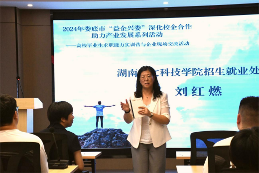 為進一步深化校企合作,助力產(chǎn)業(yè)發(fā)展,持續(xù)推動“益企興婁 ”活動,2024年7月,婁底市人力資源和社會保障局與湖南人文科 技學(xué)院聯(lián)合開辦了“婁底市首期求職能力實訓(xùn)營”。為切實提高實訓(xùn)營學(xué)員對行業(yè)企業(yè)的認(rèn)知,讓學(xué)員親身感受婁底企業(yè)的發(fā)展?fàn)?/span>況,提高學(xué)員的就業(yè)實踐能力,2024年8月7 日,由婁底市就業(yè)服務(wù)中心、湖南人文科技學(xué)院招生就業(yè)處、婁底市企業(yè)聯(lián)合會、婁底市企業(yè)家協(xié)會聯(lián)合主辦,婁底市節(jié)能環(huán)保產(chǎn)業(yè)促進中心等企業(yè)承辦,在婁星產(chǎn)業(yè)開發(fā)區(qū)產(chǎn)學(xué)研中心舉辦“2024年婁底市高校畢業(yè) 生求職能力實訓(xùn)營與企業(yè)現(xiàn)場交流活動”。湖南人文科技學(xué)院招 生就業(yè)處處長劉紅燃,婁底市就業(yè)服務(wù)中心城鄉(xiāng)就業(yè)服務(wù)部部長聶瑞成帶隊參加。