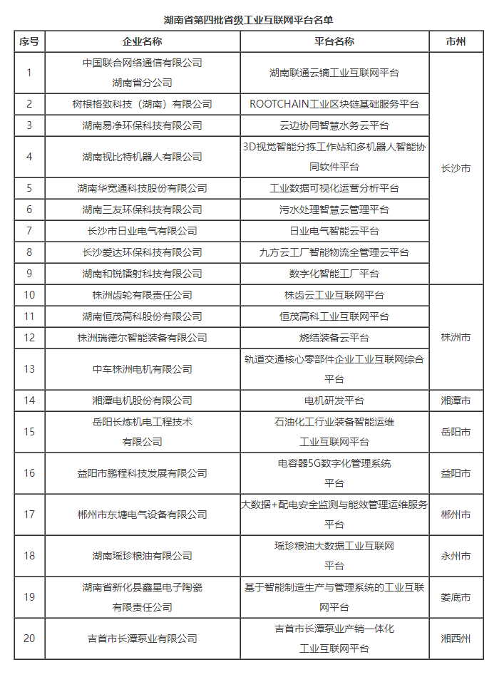 為深入貫徹落實黨的二十大精神,深化新一代信息技術(shù)與制造業(yè)融合發(fā)展,加快推進工業(yè)互聯(lián)網(wǎng)創(chuàng)新發(fā)展示范區(qū)建設(shè),根據(jù)《湖南省省級工業(yè)互聯(lián)網(wǎng)平臺認定管理辦法》(湘工信人工智能〔2020〕222號),省工信廳組織對列入2022年湖南省工業(yè)互聯(lián)網(wǎng)平臺建設(shè)計劃的平臺進行了驗收。經(jīng)企業(yè)申報、市州工信部門推薦、專家評審、線上答辯、網(wǎng)上公示等程序,同意認定湖南聯(lián)通云鏑工業(yè)互聯(lián)網(wǎng)平臺等20個工業(yè)互聯(lián)網(wǎng)平臺為第四批省級工業(yè)互聯(lián)網(wǎng)平臺,現(xiàn)予公布。