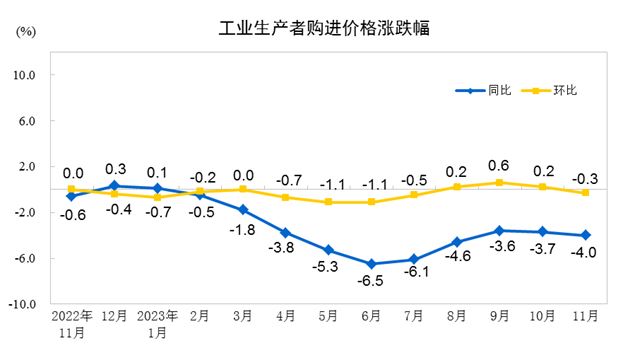 202311月份,全國(guó)工業(yè)生產(chǎn)者出廠(chǎng)價(jià)格同比下降3.0%,環(huán)比下降0.3%;工業(yè)生產(chǎn)者購(gòu)進(jìn)價(jià)格同比下降4.0%,環(huán)比下降0.3%。111月平均,工業(yè)生產(chǎn)者出廠(chǎng)價(jià)格比上年同期下降3.1%,工業(yè)生產(chǎn)者購(gòu)進(jìn)價(jià)格下降3.6%。