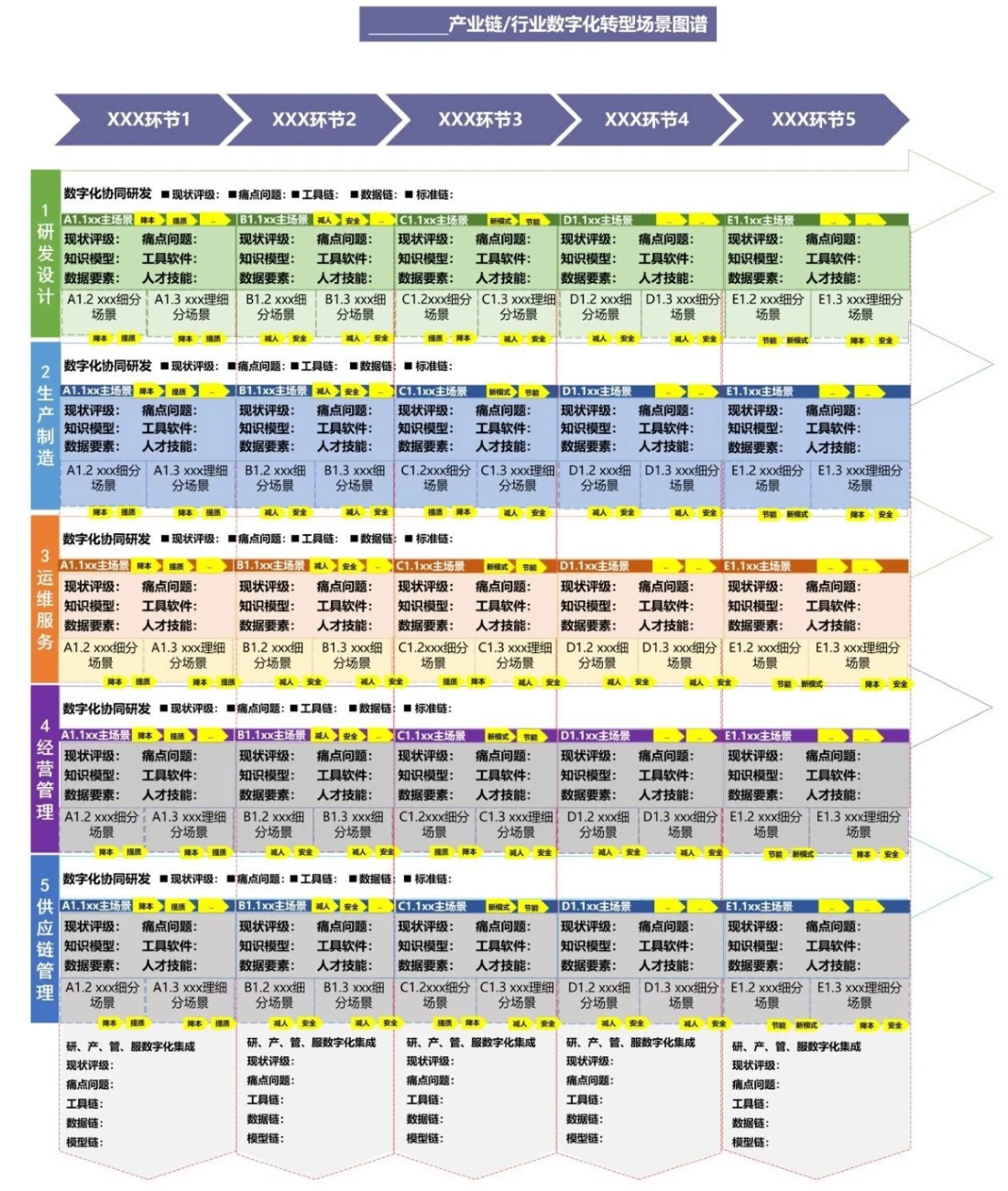 制造業(yè)企業(yè)數(shù)字化轉(zhuǎn)型典型場景參考聚焦產(chǎn)業(yè)鏈上下游企業(yè)研發(fā)設(shè)計(jì)、生產(chǎn)制造、運(yùn)維服務(wù)、經(jīng)營管理、供應(yīng)鏈管理等場景,以場景為切入點(diǎn)梳理數(shù)字化轉(zhuǎn)型痛點(diǎn)需求,繪制重點(diǎn)行業(yè)、重點(diǎn)產(chǎn)業(yè)鏈數(shù)字化轉(zhuǎn)型場景圖譜(簡稱“一圖譜”),明確企業(yè)數(shù)字化轉(zhuǎn)型路徑,促進(jìn)產(chǎn)業(yè)鏈上下游企業(yè)協(xié)同開展轉(zhuǎn)型升級。分場景梳理數(shù)據(jù)要素、知識模型、工具軟件、人才技能等數(shù)字化轉(zhuǎn)型要素清單(簡稱“四清單”,合稱“一圖四清單”),助力政產(chǎn)學(xué)研各界聯(lián)合攻堅(jiān)場景數(shù)字化轉(zhuǎn)型關(guān)鍵難點(diǎn)。